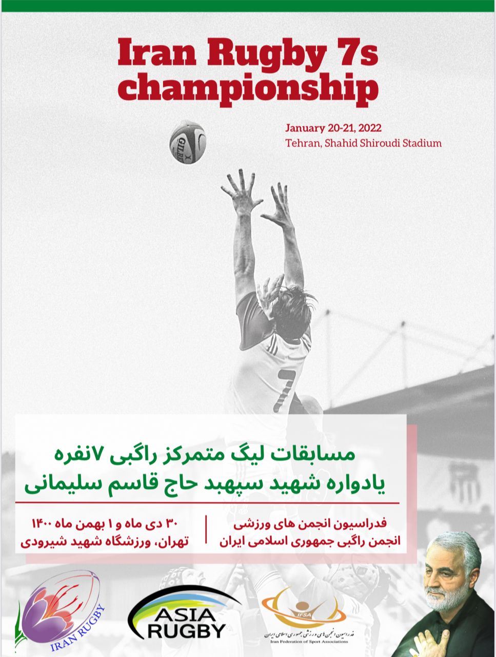 تهران میزبان مسابقات لیگ راگبی 7 نفره مردان کشور مسابقات لیگ راگبی 7 نفره مردان کشور یادواره شهید سپهبد حاج قاسم سلیمانی طی روزهای پنج شنبه و جمعه هفته جاری 30 دی و اول بهمن به میزبانی تهران برگزار می شود. به گزارش روابط عمومی فدراسیون انجمنهای ورزشی، این رقابتها با حضور تیمهایی از تهران، مشهد، تبریز، اصفهان، قم ، شیراز و مازندران بصورت متمرکز در ورزشگاه شهید شیرودی تهران برگزار خواهد شد. |